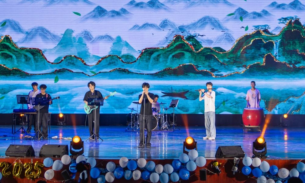 晚会在乐队表演的《不说再见》和《闪耀》中拉开序幕,激昂的旋律里,唱出了毕业生们对校园的眷恋与未来的憧憬。随后,学院李童童老师带来大气磅礴的独唱《和谐中国》,用歌声传递家国情怀,以优美旋律唱响时代华章。当《平凡之路》《你曾是少年》《凤凰花开的路口》这些熟悉的旋律响起,台下观众自发点亮手机闪光灯,化作星海随节拍轻轻摇曳,全场沉浸在这场关于青春、成长与告别的集体回忆中。活力四射的舞蹈串烧《Funk Alarm》和《One Spark》中,2023级辅导员郑威老师与Only Crew舞社的同学们以极具感染力的舞姿,完美演绎了青春的蓬勃朝气与无限可能。在庄重激昂的朗诵节目《廉洁颂》中,用掷地有声的语调、饱满真挚的情感,为青春年华注入清正廉洁的责任底色。灯影戏《我们的四年青春》以其独特的艺术形式成为最动人的“情感催化剂”,通过光影的魔力将大学四年的成长蜕变、青春追忆与离别愁绪娓娓道来,引发全场共鸣。毕业生们自己作词改编的歌曲《二环南路的日子》,以饱含深情的歌词和旋律,为全场带来了一场对“济大”的青春告白,让四年的欢笑与泪水都在歌声中得到了最完美的诠释。在晚会的尾声,一曲精心编排的歌曲串烧《光阴的故事》与《明天会更好》将现场气氛推向高潮,当熟悉的旋律响起,台上台下共同哼唱,共同谱写毕业季最动人的青春乐章。