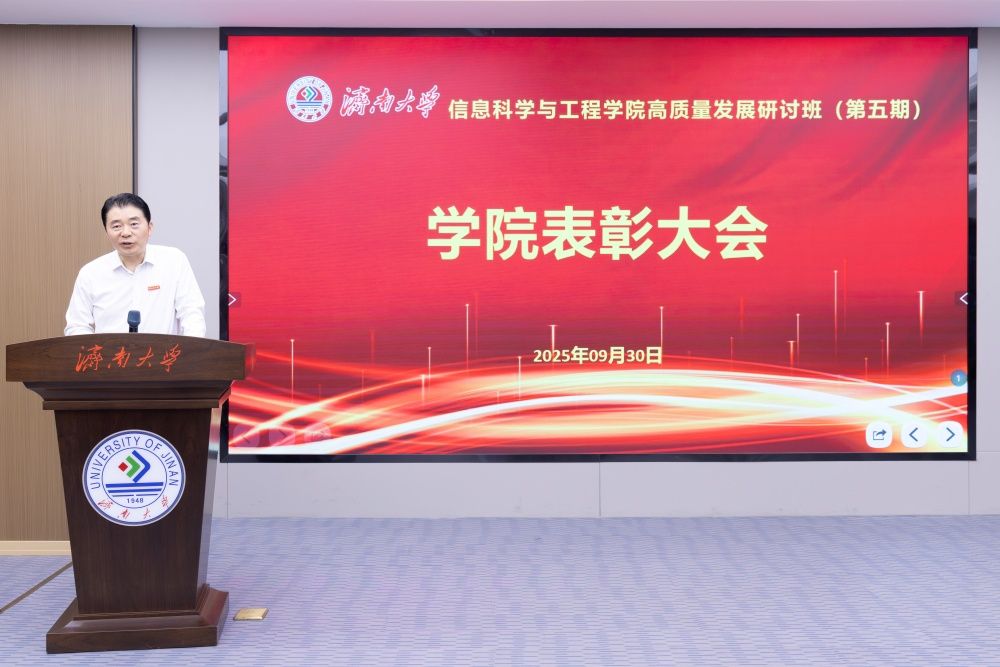 高质量发展研讨班(第五期)暨学院表彰大会在第五学术报告厅举行。学校党委常委、纪委书记、省监委驻济南大学监察专员续铁,党委学生工作处、人力资源处、教务处、科技处、研究生院、校团委等部门负责人及学院领导班子出席会议,学院获奖教师及教师代表参加会议。会议由学院党委书记夏卫东主持。