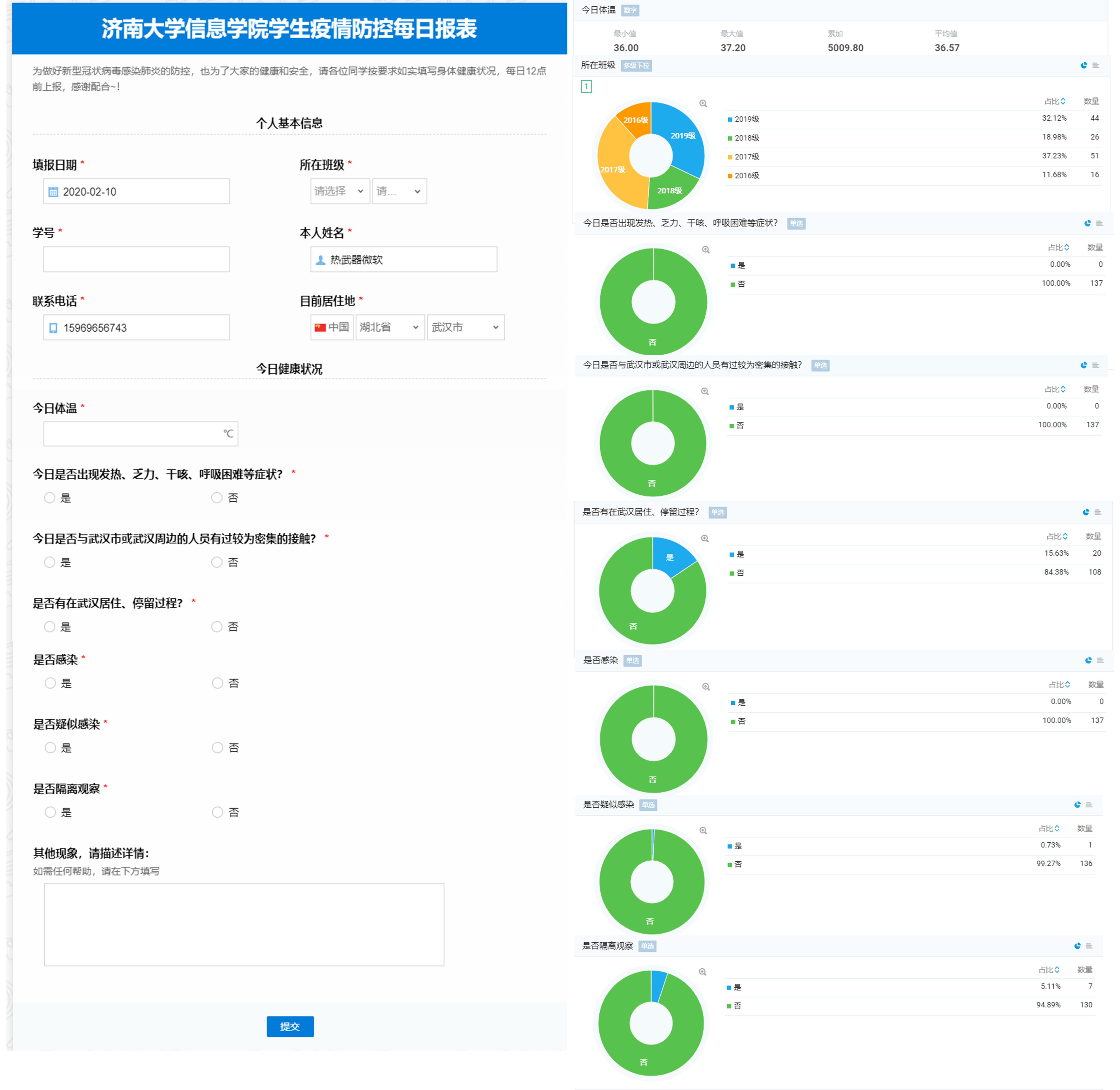 对于学院教职工,建立系部主任定期汇报制度,对本系部教师情况进行摸排汇总,并及时汇报;对全体学生,以年级、班级为单位,建立辅导员—主要学生干部—全班学生的疫情防控信息网,每日排查班级同学身体健康情况并汇总上报,实时掌握全院学生情况,并及时通过网络宣传、群发通知等方式号召同学们响应国家和学校号召,服从当地、学校、学院疫情防控工作安排,居家做好科学抗疫的带头者;对有湖北地区停留史、与相关人员有接触以及疫情较严重地区的学生及时进行完善摸排,推出“济南大学信息学院学生疫情防控每日报表”系统,通过系统可快速、全面的掌握学生每日动态信息,更有针对性的做好疫情防控工作。