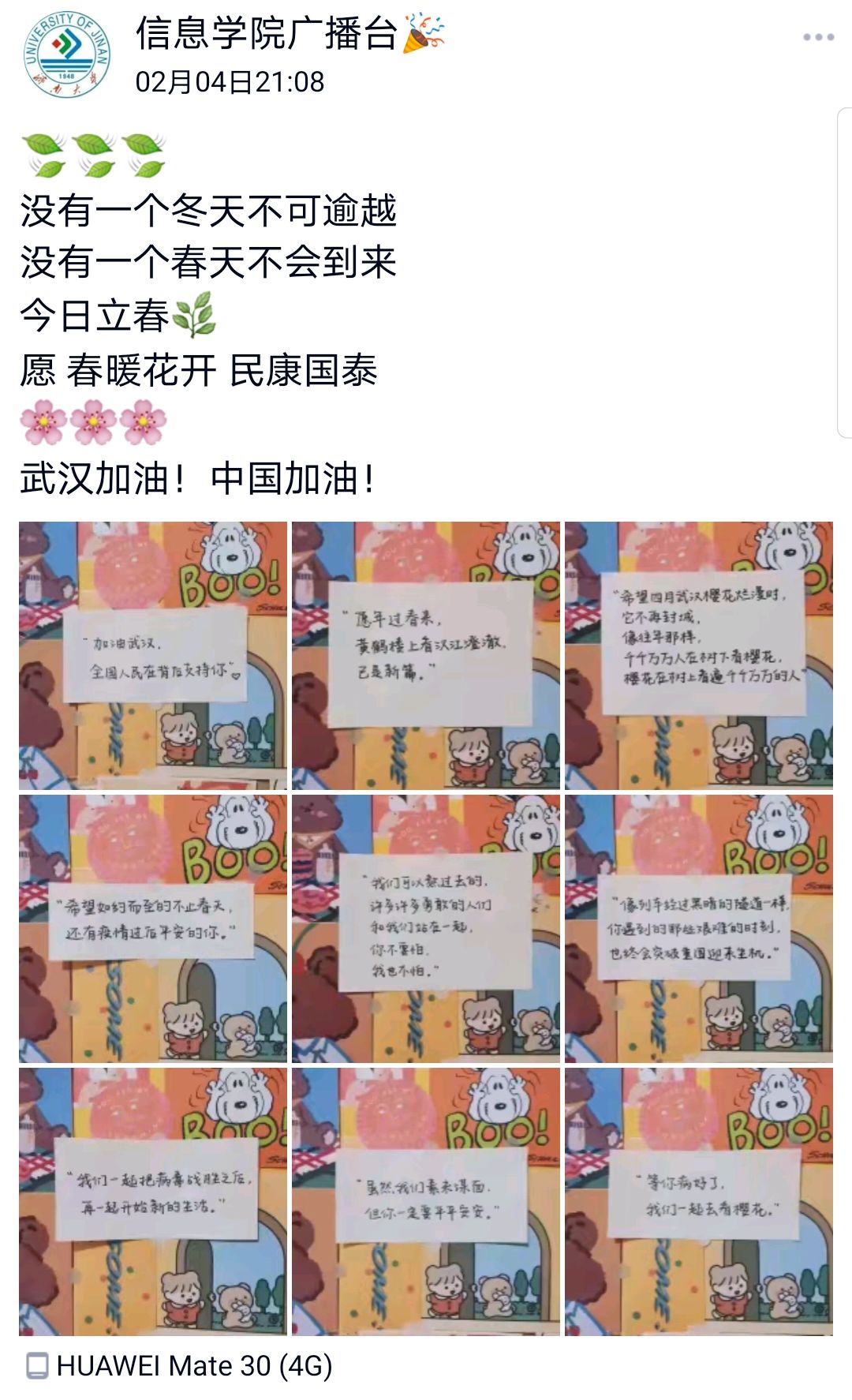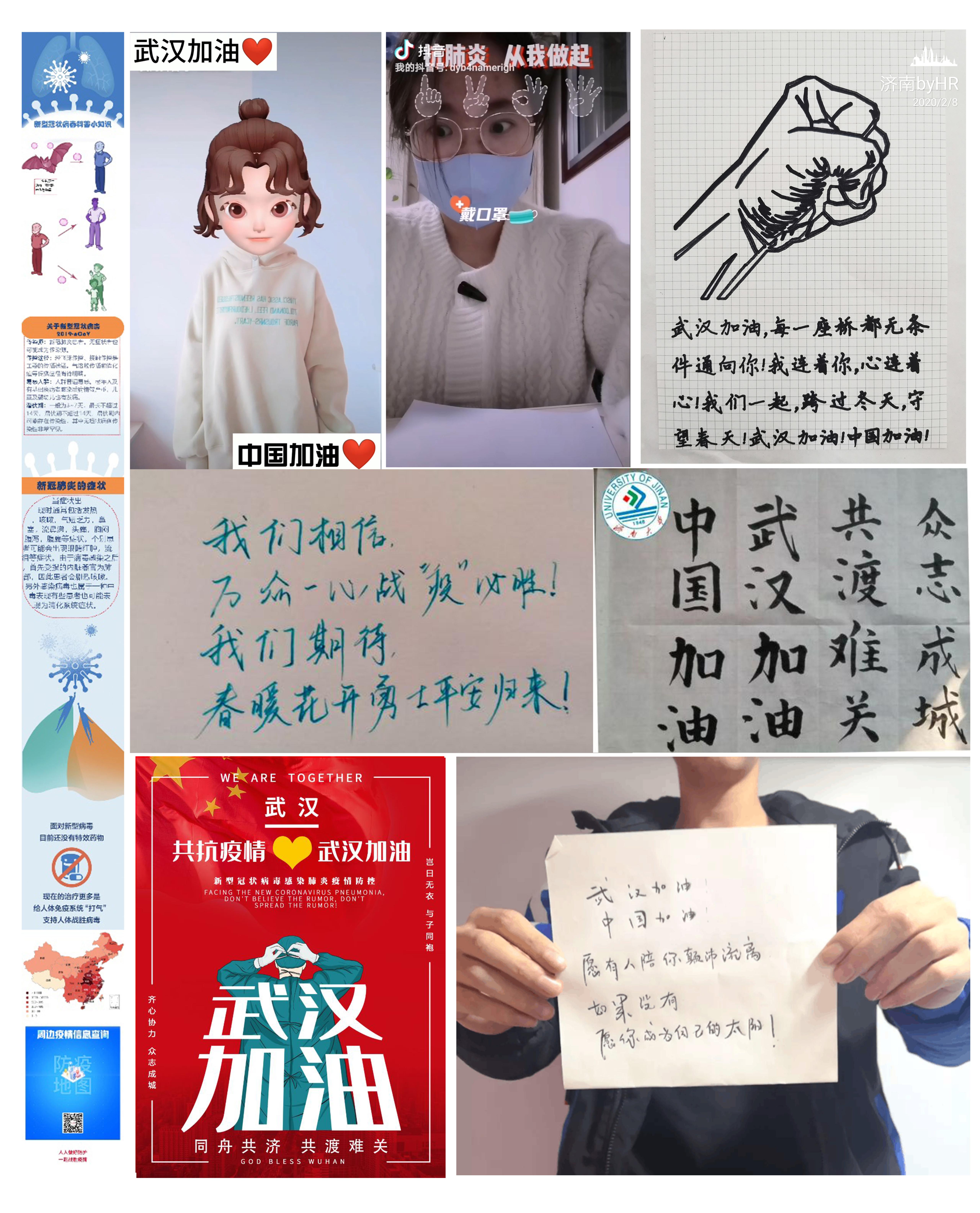 信息学院充分发挥专业特色和新媒体平台优势,制作出一批优秀的防控疫情、传达爱心的文化作品,展现信息青年们的健康生活,通过宣传视频、制作海报、原创书信、诗歌等方式为武汉加油,为中国加油,为在战“疫”第一线的医护人员、武汉人民送上温暖祝福,注入必胜信念,展现新时代青年在疫情面前的使命感与青春担当。