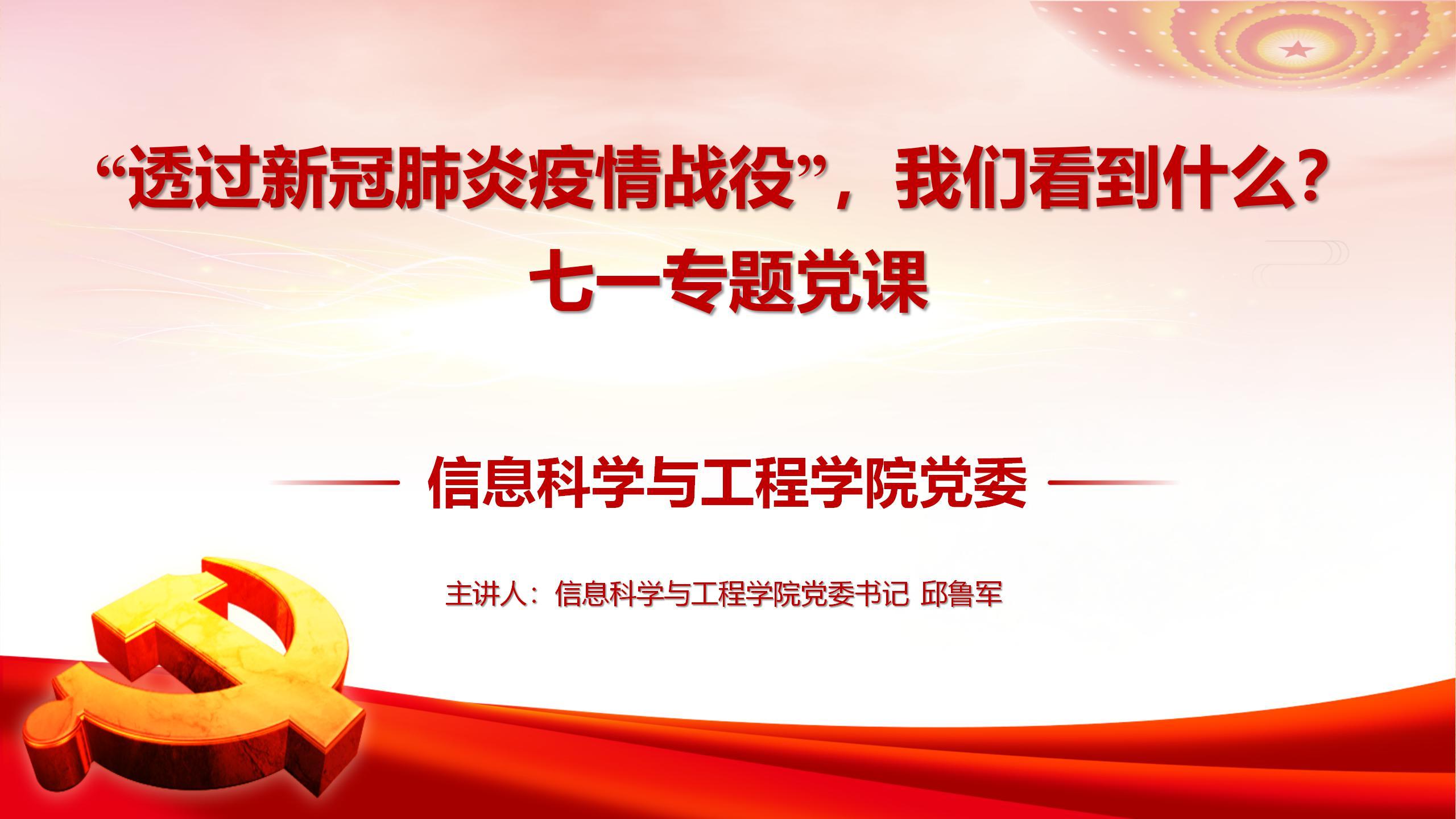 为庆祝中国共产党成立99周年,深入学习贯彻习近平新时代中国特色社会主义思想,切实增强全院师生党员政治意识、大局意识、核心意识、看齐意识,6月30日下午,电竞投注平台 党委书记邱鲁军以《透过新冠肺炎疫情战役,我们看到了什么》为主题,为全院师生党员讲授了一场生动的专题党课。党课由院长陈贞翔主持。