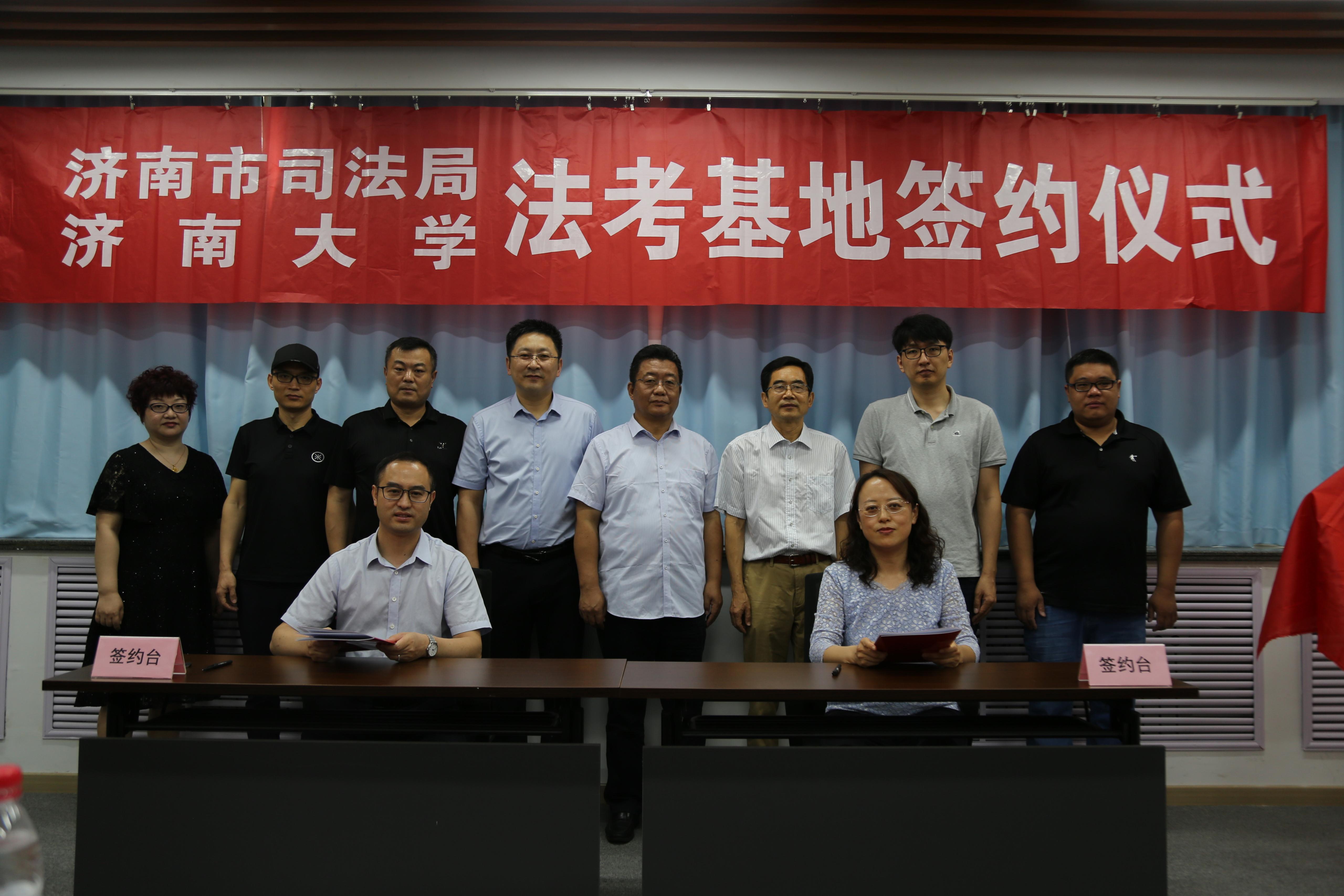 签署合作协议之后,济南市司法局副局长王春平同志和济南大学合作发展处处长卢旺同志为“济南法考基地”进行了揭牌。