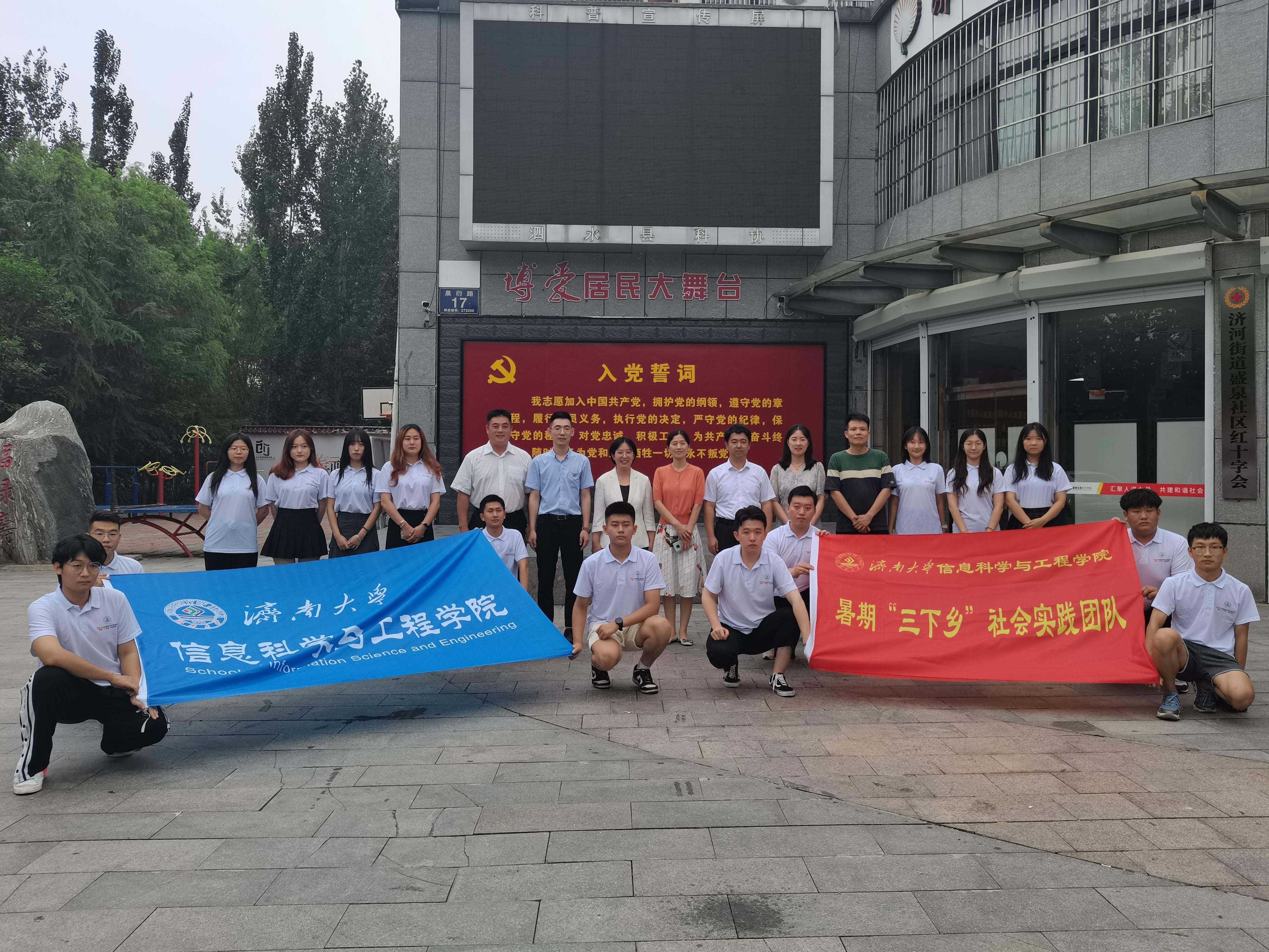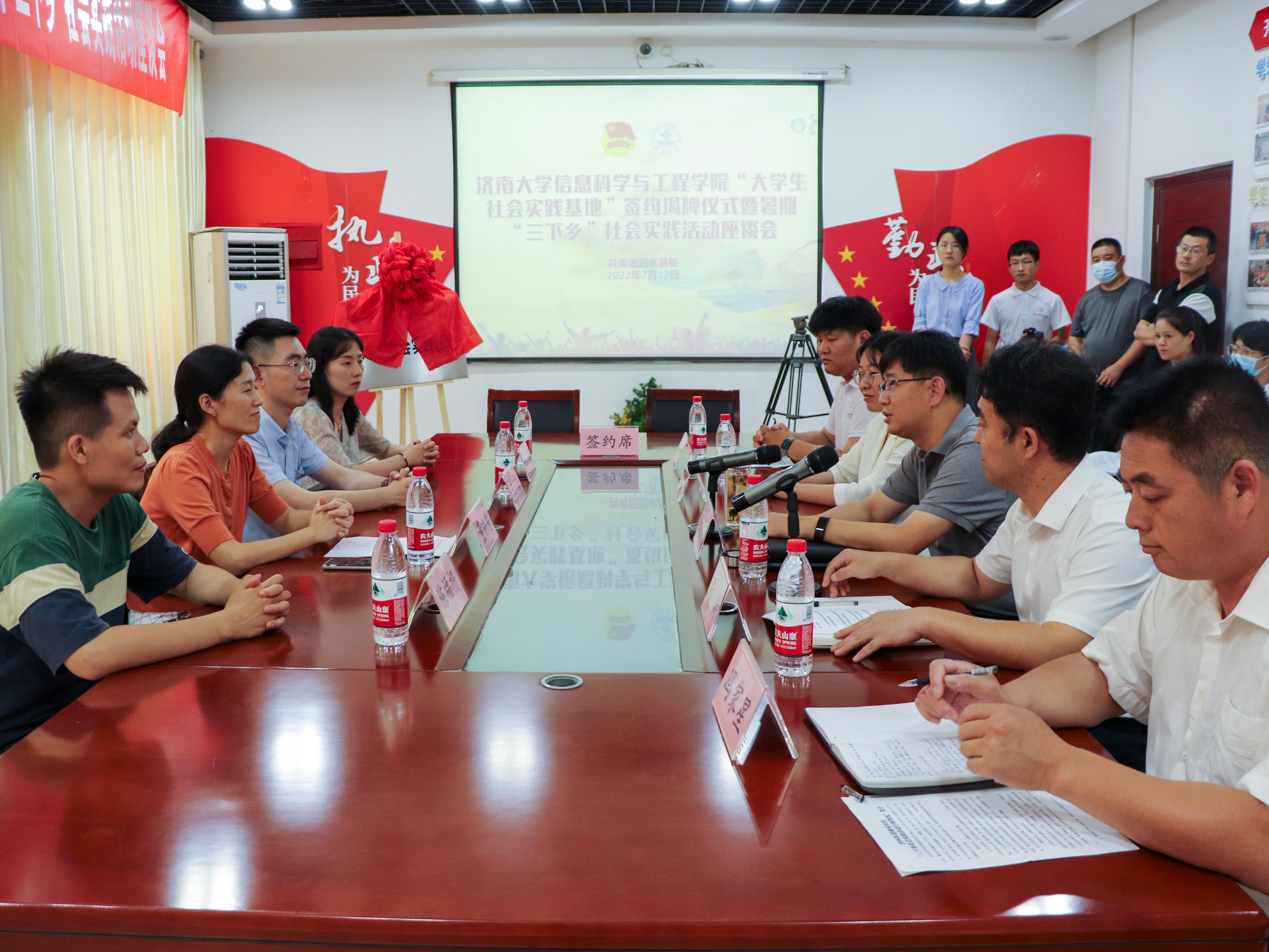 与共青团泗水县委、泗水县济河街道盛泉社区举行“大学生社会实践基地”签约揭牌仪式暨暑期“三下乡”社会实践活动座谈会,泗水县委副书记张宇飞,共青团泗水县委书记王晓,济河街道盛泉社区党委书记冯家星,电竞投注平台