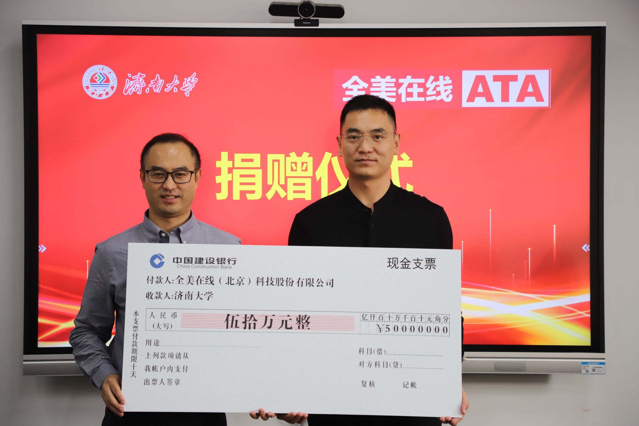全美在线(北京)科技股份有限公司成立于2006年,公司围绕“一核两翼”的战略布局,专注于考试测评的核心业务,不断向人才能力提升和招聘求职延展,为考试主办方、考生提供考试测评技术和运营服务。在济南大学庆祝办学75周年之际,公司向学校捐赠50万元,专款用于第12号教学楼8层环境改造,将为师生教学、科研等提供更加良好的条件保障。