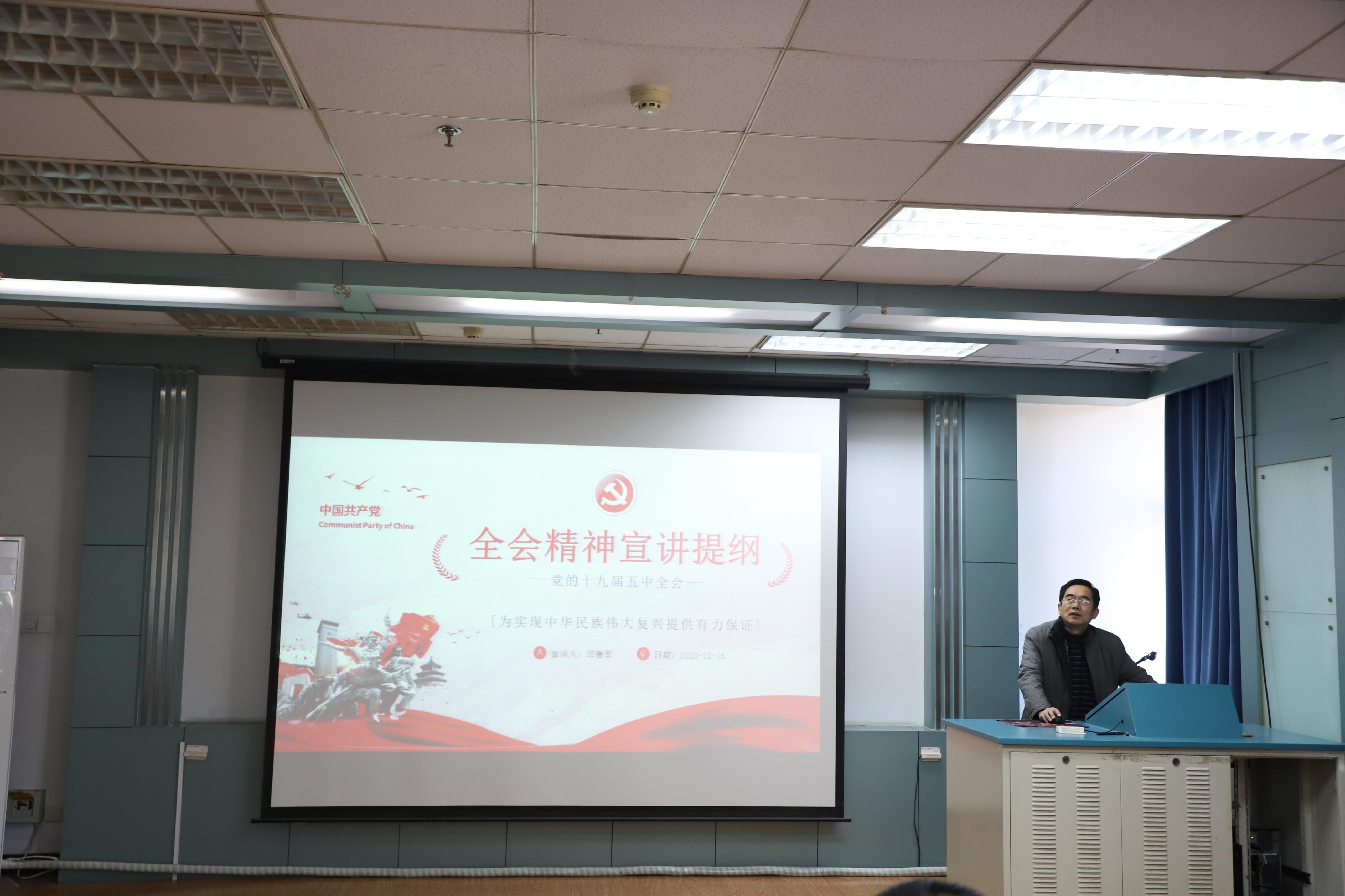 在12教703教室举行学习贯彻党的十九届五中全会宣讲会,学院党委书记邱鲁军作专题报告,学院各党支部书记、支部委员以及学生代表参加宣讲会。
