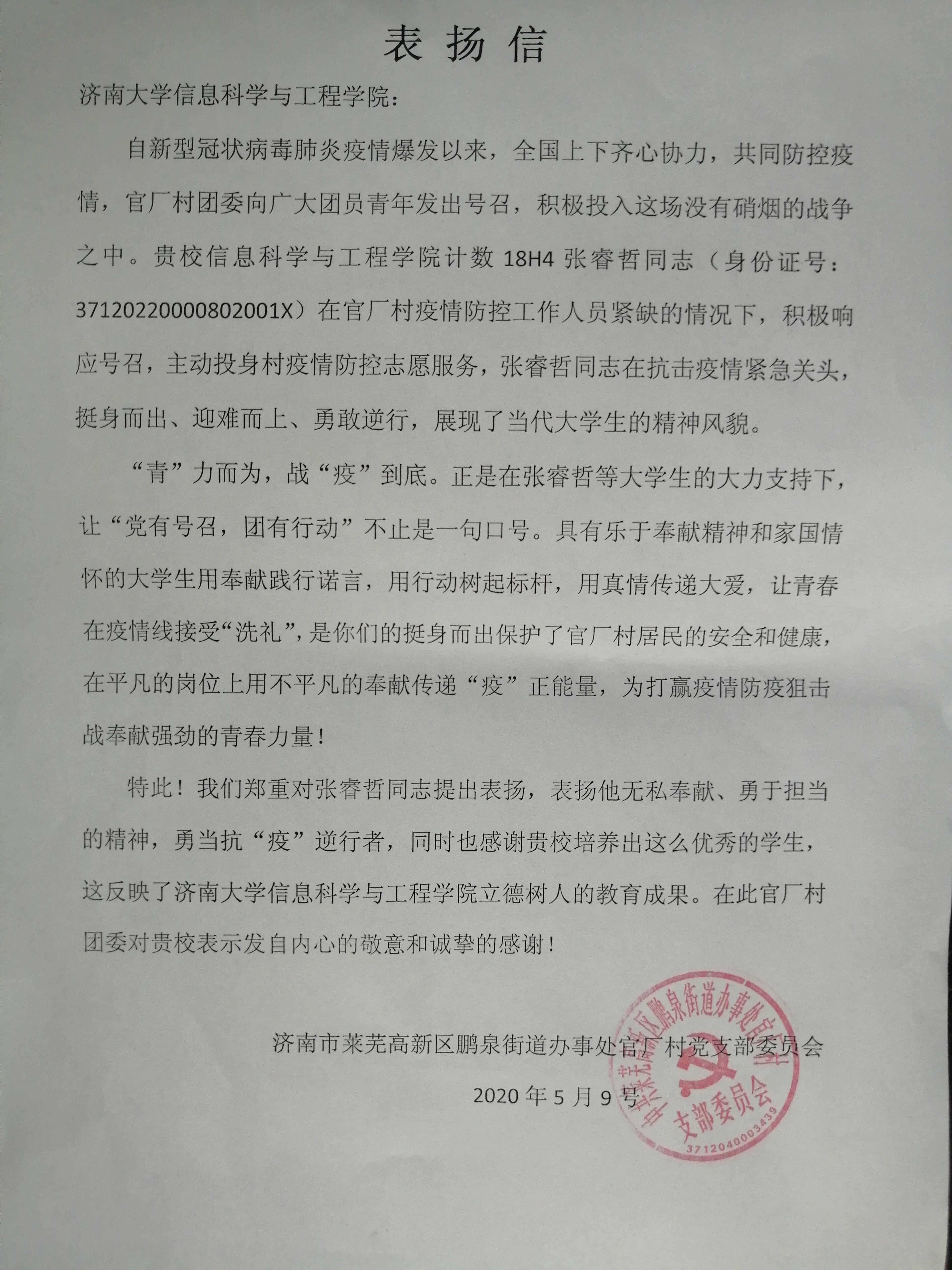 接到感谢信后,高度赞扬了张睿哲同学这种危难面前的无私奉献精神。张睿哲同学表示:“我作为济南大学信息学院的一名大学生,尽管不能像白衣天使们一样奋斗在抗疫一线上,但我还是希望能通过自己的努力为疫情防控工作奉献我的绵薄之力,期待我们可以早一点返回美丽的校园。”