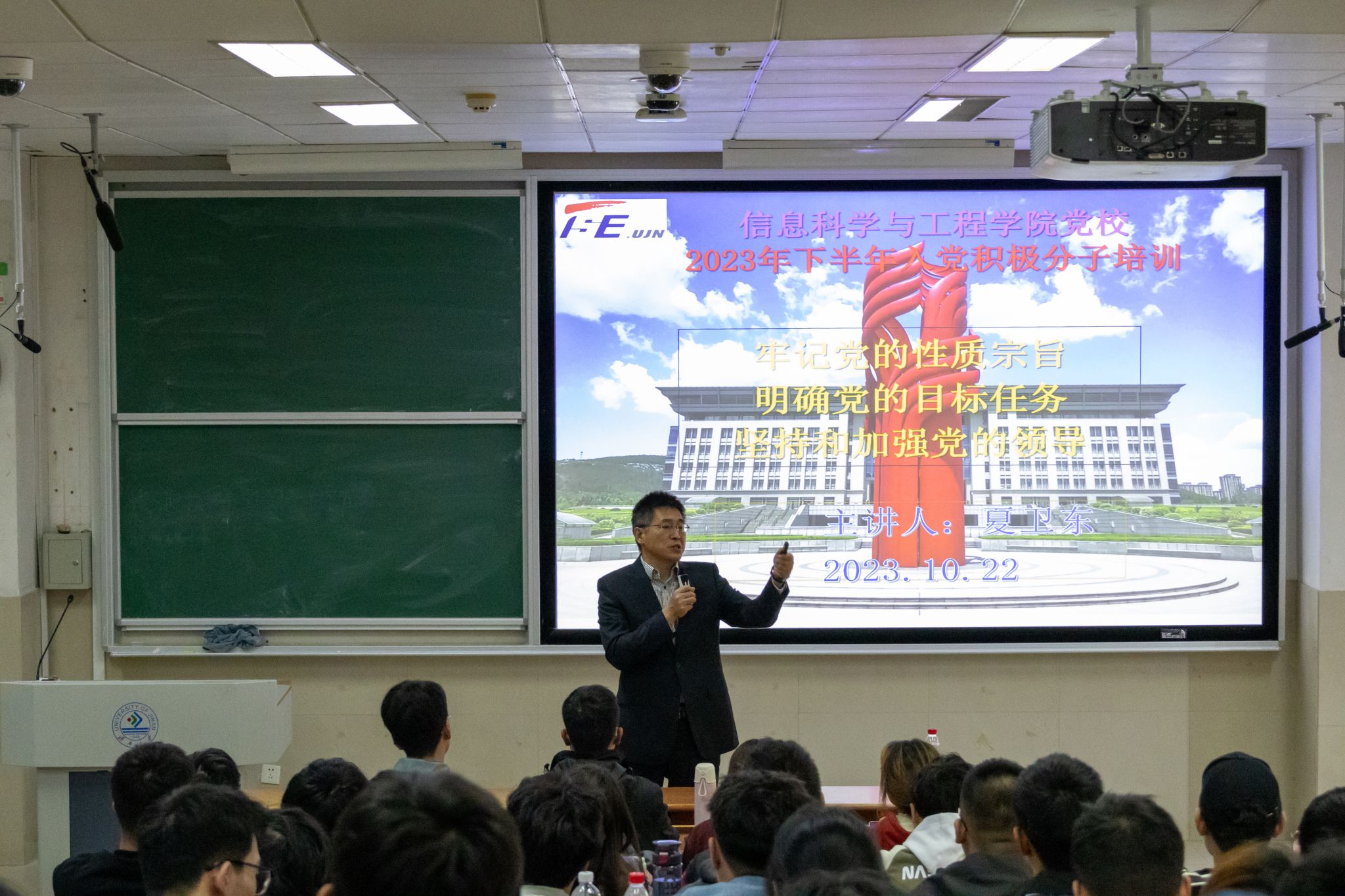 学院党委书记夏卫东以《牢记党的性质宗旨、明确党的目标任务、坚持和加强党的领导》为题,强调作为一名入党积极分子和党员,要牢记党的宗旨,永葆党的先进性品格,全心全意为人民服务,希望大家坚定入党决心和信心,积极接受党组织的培养教育和经验考察,担当作为,铭记责任,在思想、学习、生活、工作等多方面,全面提高自己,创造新的成绩,争取早日加入党组织。
