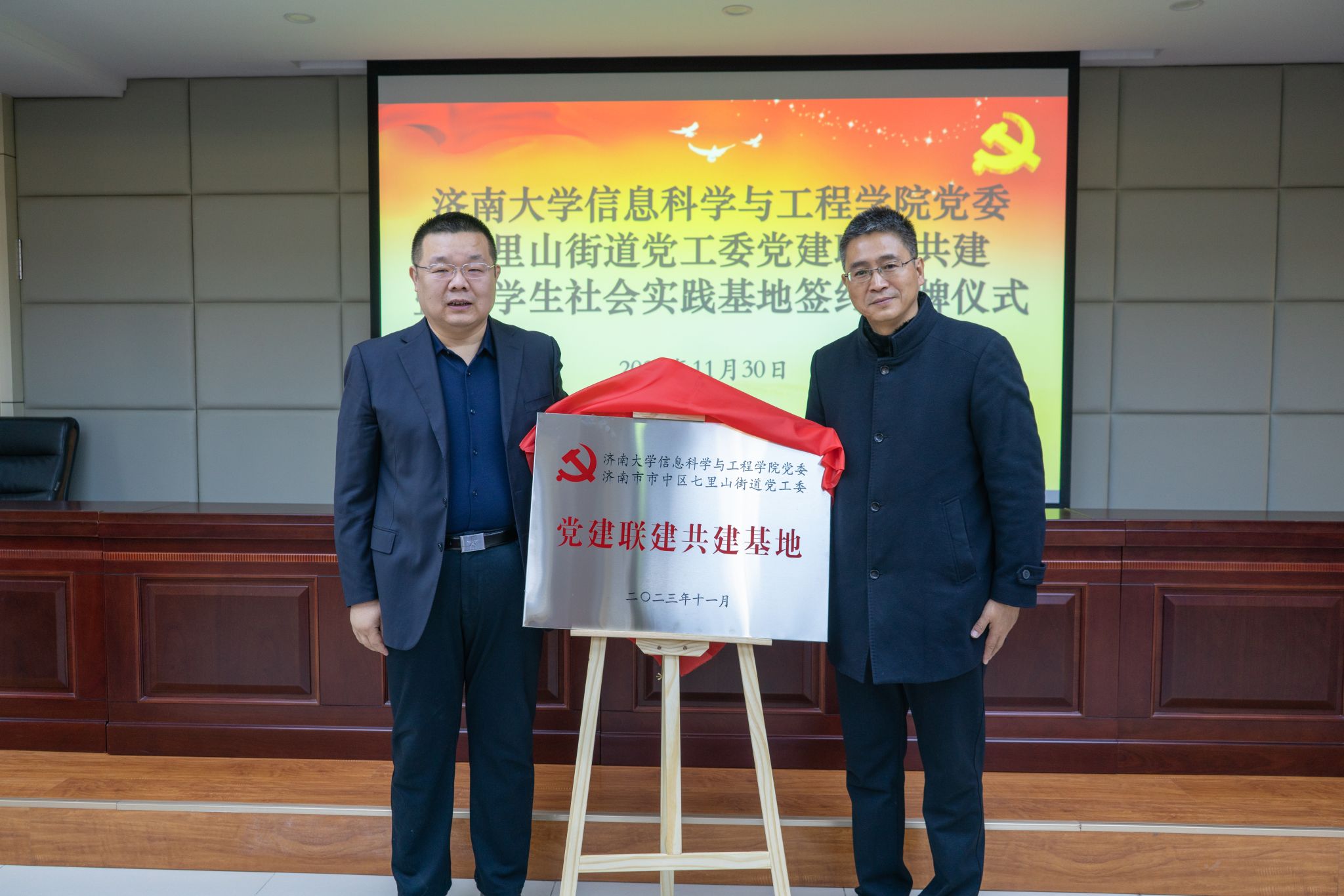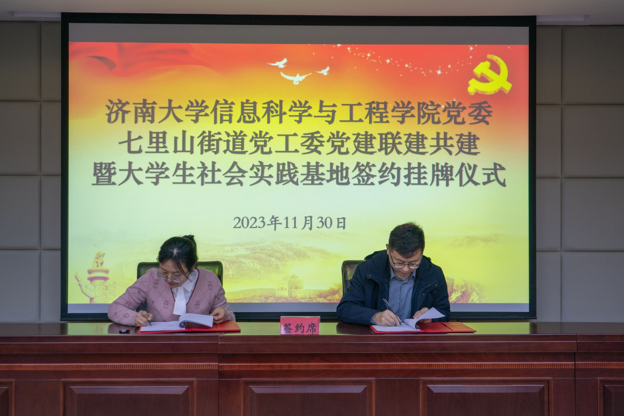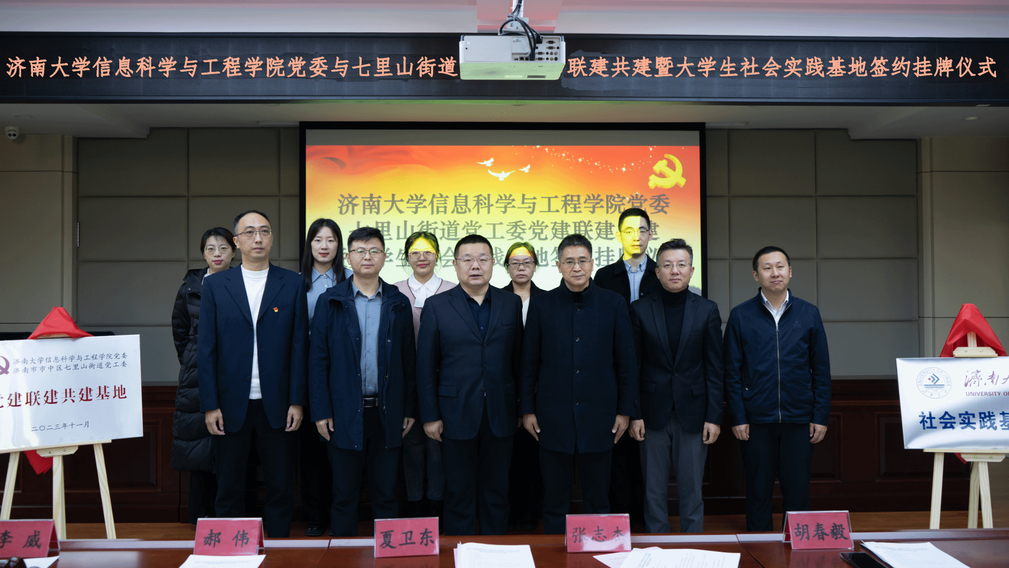 与济南市市中区七里山街道党工委党建联建共建暨大学生社会实践基地签约挂牌仪式在七里山街道党群服务中心举行,共青团济南市市中区委书记党淼,济南市市中区七里山街道党工委书记张志杰,党工委副书记李威,党工委委员、办事处副主任隗娜,济南大学团委书记胡春毅,电竞投注平台
