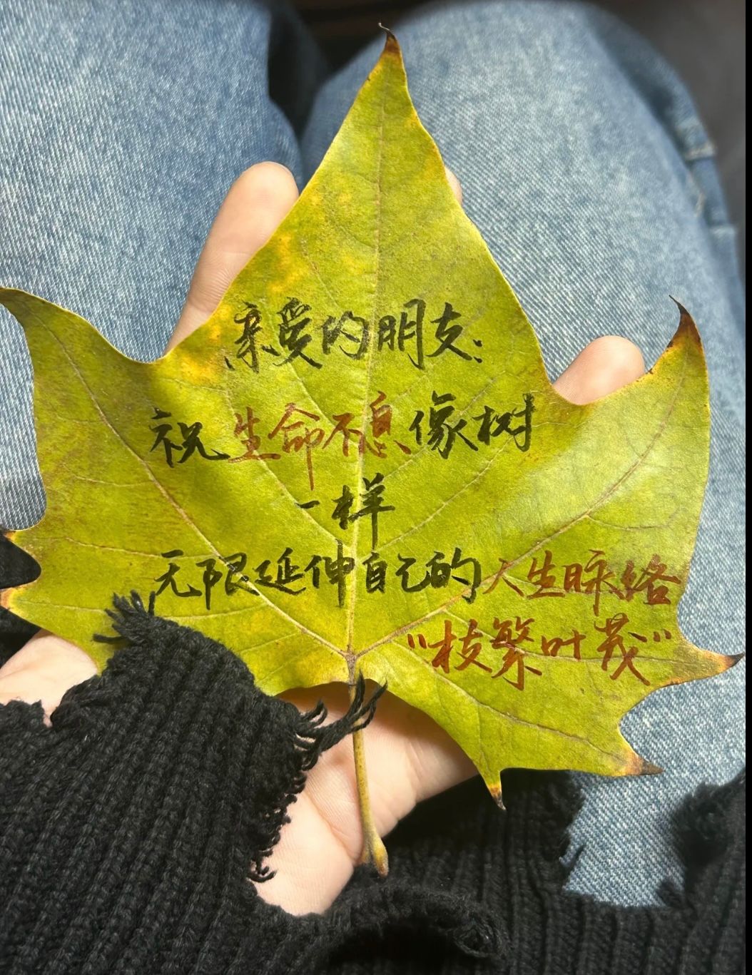 活动中,学生们将心中的祝福与期许寄于落叶与信纸之上,五彩斑斓的秋叶与饱含深情的信纸相映成趣。有的学生精心挑选出一片脉络清晰的枫叶,在上面工工整整地写下对远方好友的思念与鼓励;有的则在信纸上洋洋洒洒地倾诉着对家人的感恩与牵挂,并将信纸夹于银杏叶间。这些承载着学生们心意的落叶信纸,借由爱的信使,送到亲朋好友手中,甚至跨越时空,送回给自己,成为一份独特的自我礼物。