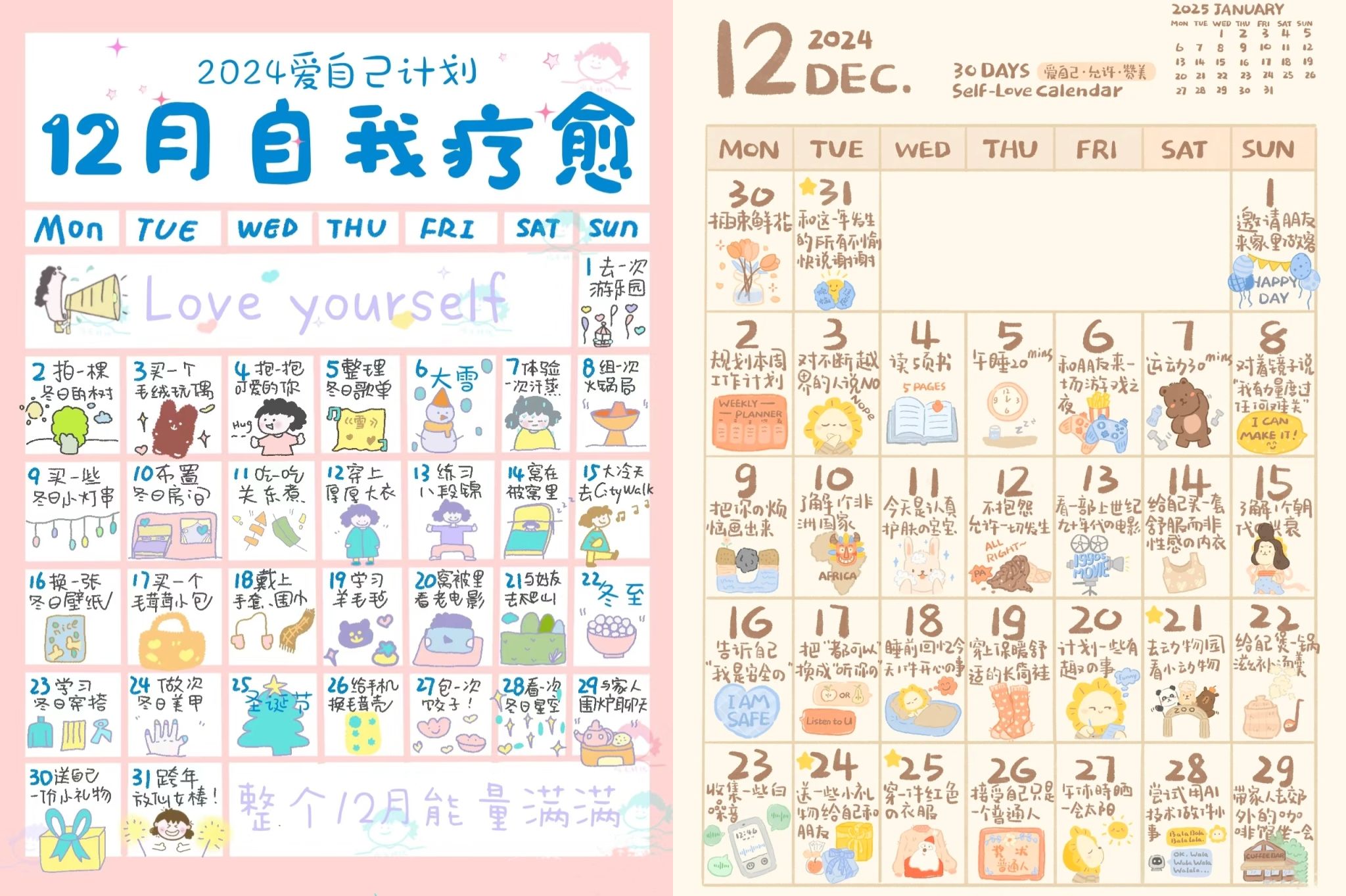 心理协会在2024年12月4日至12月9日,成功举办了一场充满温情的“December”十二月快乐疗愈日历创意设计活动。本次活动以“疗愈”为核心主题,旨在借助创意设计的力量,为大学生搭建一个心灵的港湾,助力他们在忙碌的学习生活中找到宁静与安慰,从而提升心理健康水平。