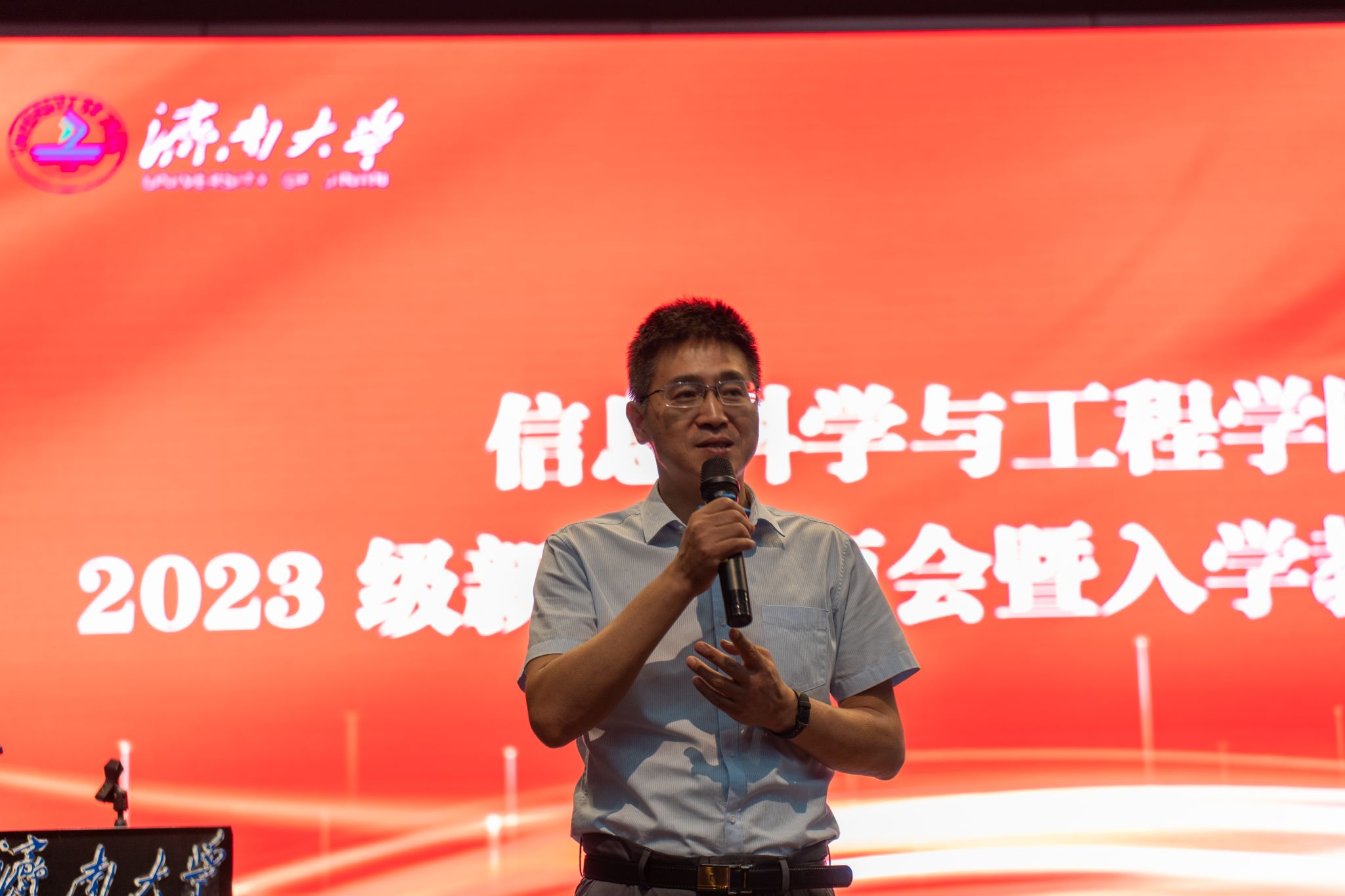 陈贞翔院长首先致辞,他代表学院向2023级全体新生的到来表示衷心的祝贺和热烈的欢迎,向辛勤培育学子成长的父母和师长致以了崇高的敬意和诚挚的感谢。他介绍了学院的基本情况与发展历程,并对2023级新同学提出了四点殷切希望:一要掌握大学学习之道,潜心向学、努力成才;二要养成良好的品行,当一个有责任的社会公民;三要涵养家国情怀,以“大我”定位“小我”;四要勇担时代责任,矢志接续奋斗,努力推动国家人工智能领域的创新发展。陈贞翔围绕“弘毅、博学、求真、至善”的校训,希望同学们努力学习,不负韶华,用奋斗点亮人生,用行动书写青春最璀璨绚丽的新篇章。