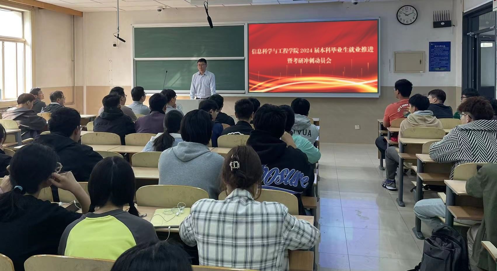 2024届本科毕业生就业推进暨考研冲刺动员会于第十教学楼顺利召开。学院党委副书记、副院长郝伟,副院长杨晓晖,各系系主任,部分研究生导师及相关学工人员出席本次会议,2024届200余名本科毕业生代表参加会议。会议邀请山东大学李阳教授,学院集成电路系系主任张春伟副教授,计算机系牛四杰教授、夏英杰老师和王琳教授课题组在读博士宁帅作指导交流。动员会由2020级辅导员孟莹主持。