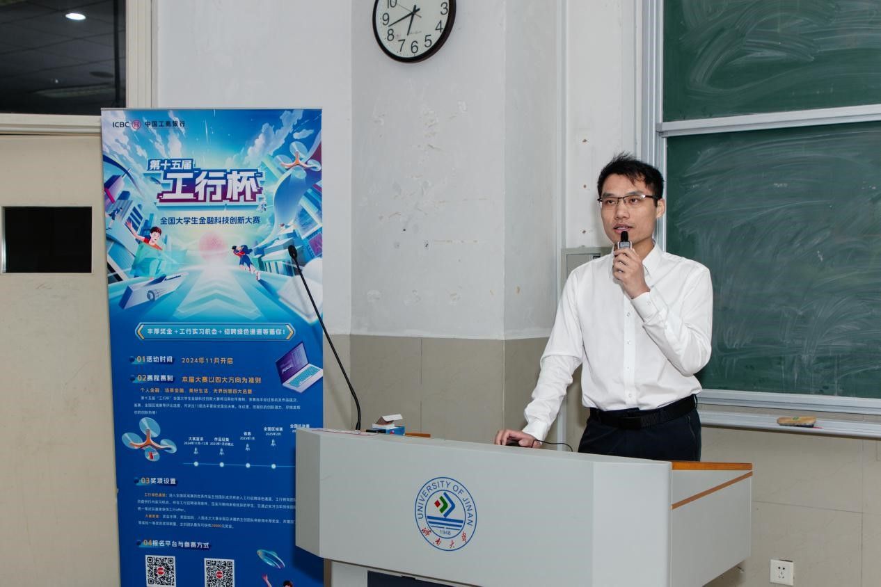 主办的青春创新创业论坛暨“工行杯”金融科技创新大赛宣讲会于10月26日在11J5401成功举办。本次宣讲会特邀山东省济南工行金融科技部经理巩文双老师担任主讲嘉宾。巩老师在山东大学、齐鲁工业大学、山东交通学院以及山东传媒学院等多所高校均进行了“工行杯”金融科技创新大赛的专题讲座,积累了丰富的高校演讲经验,并对比赛政策有着深刻理解及掌握相关竞赛技巧。
