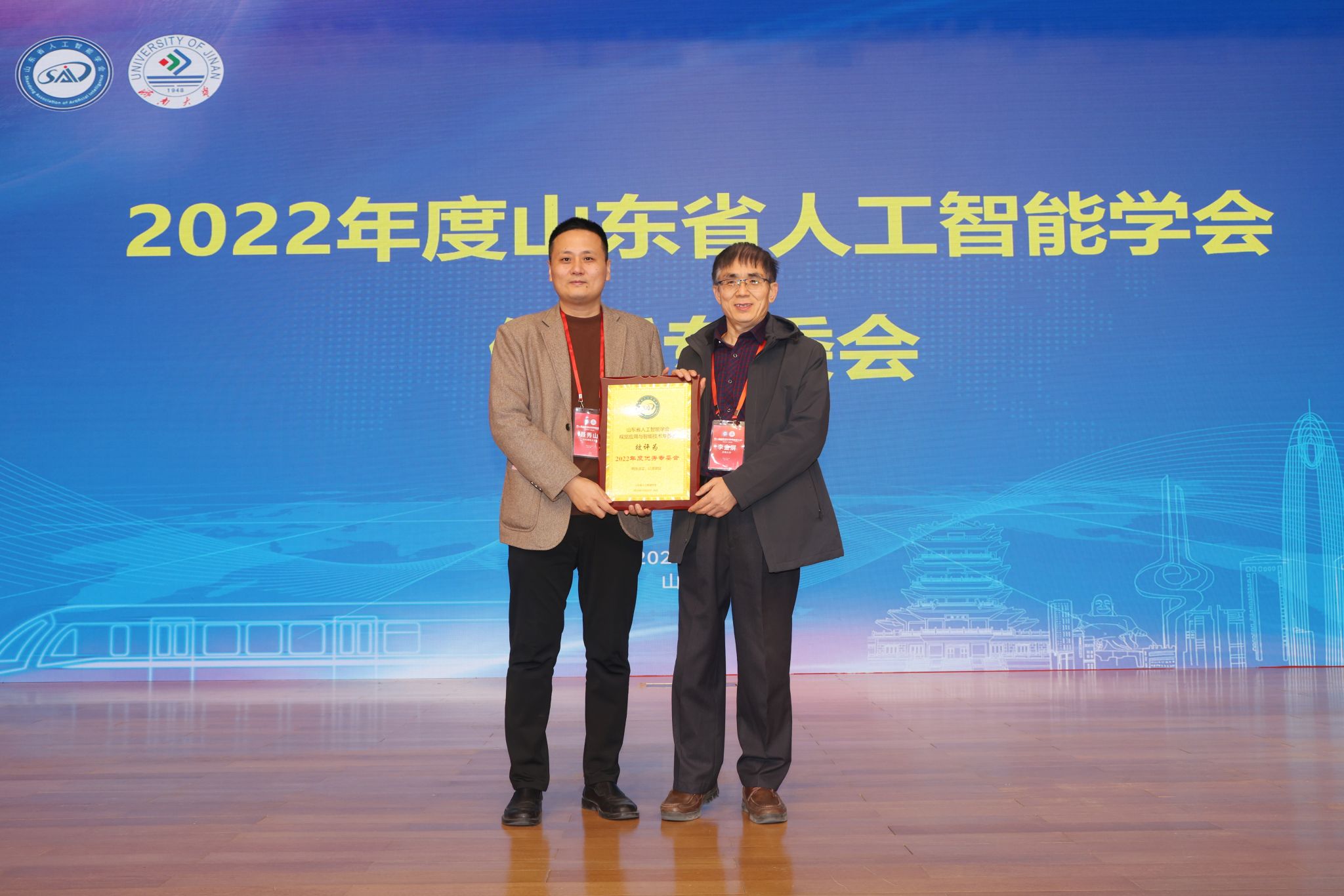 教授、视觉应用与智能技术专委会主任李金屏领取了2022年度山东省人工智能学会优秀专委会奖牌。此外,活动还为山东省计算机视觉最佳和优秀论文奖、山东省视觉创新与应用领航和先进单位颁发了证书与奖牌。